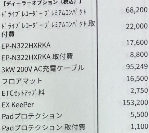 購入の際にディーラーから勧められたアクセサリー。電気自動車が初めてだったので、今回はほぼ言われるがままに購入した。ちなみに、オプションのカタログはメーカーホームページを見てもらえればと思う。だが、この中にも絶対に要らないものがいくつかある。