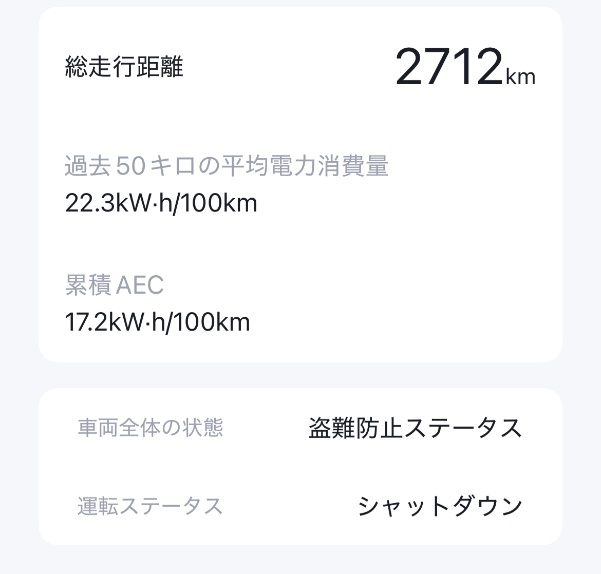 走行距離も2000kmを超え、慣らし運転も終わったため、先日新東名を走ってみた。冬場で気温が下がり、燃費が落ちるということもあるが、高速走行では距離は延びない。新東名で運転アシストを使って時速100-120kmで走ってみた。電力消費は22.3kwh/100kmという状況で、この速度で走行するとフル充電で250-260km程度の走行距離になる。印象としては、この季節はフル充電から走り倒して250km、街乗り限定で380kmというレベルと思われる。職場に日産のリーフがあるが、どのEV車もカタログ値の6-8割が実際に使用した際の航続距離の様である。